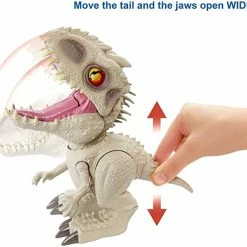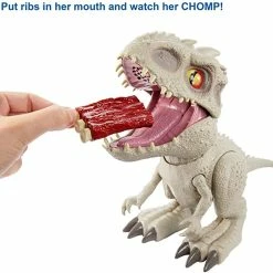 - Push back the tail and the mouth opens so kids can put the “Toy Ribs” (included) in her mouth and she releases a massive chomp