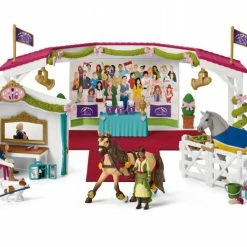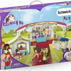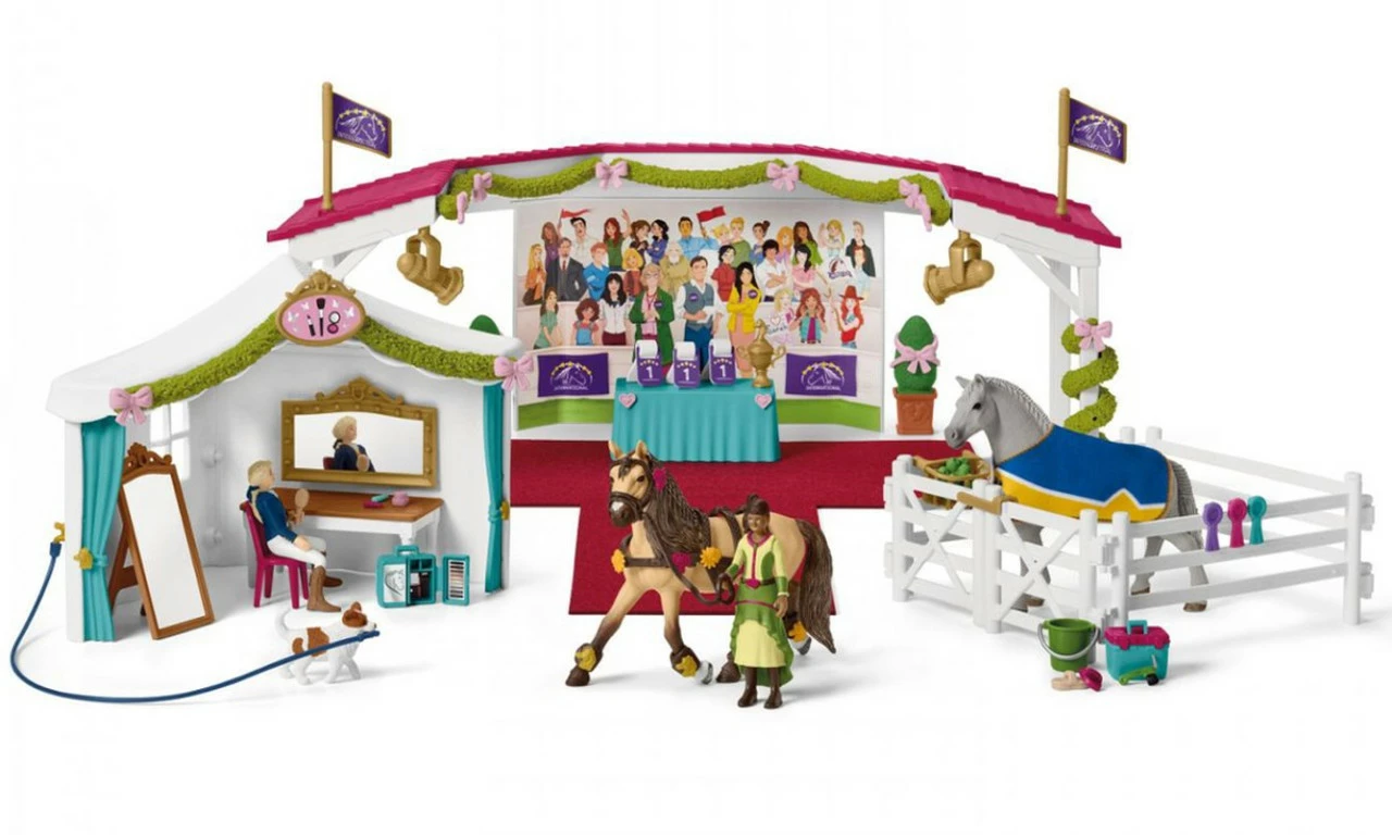 The Schleich® Horse Club big horse show is taking place at Lakeside! Sarah and Tori are cleaning their Tennessee walking mare and Lusitano stallion with a hoof pick, curry comb and brush from the grooming box. From the back of the arena, they fetch decorative hearts, bows and flowers to put on the bridle, harness and spats. In the tent, the girls make themselves up in front of their mirrors with the lipstick, make-up brush and compact from their make-up case. Outside, the arena is decorated with plants, bows, vine bunting and flags. Its showtime! Sarah smooths down her pull-off skirt, while Tori takes the blanket off her horse. Beneath the spotlights, they lead the horses from the paddock and over the carpet to the jurys table. What will be on the scoreboards? Luckily there are only winners, as there are rosettes as well as the trophy! With over 100 accessories, the set promises hours of play!