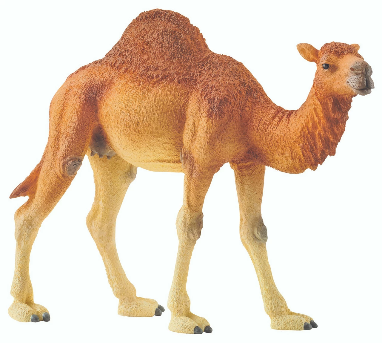 Dromedaries live in the deserts of Africa and Asia. They eat mostly leaves, dry grass and thorny plants. The hump of the mammal isn’t used to store water; it stores fat. If they can’t find any food in the desert they can live off it for weeks. The dromedary from Schleich® Wild Life has eaten well recently and has an upright, well-filled hump.