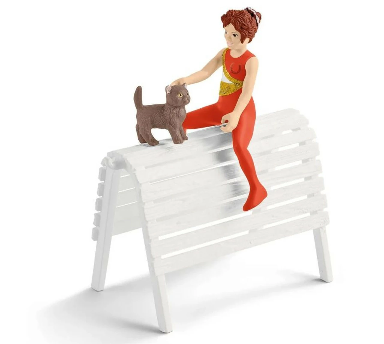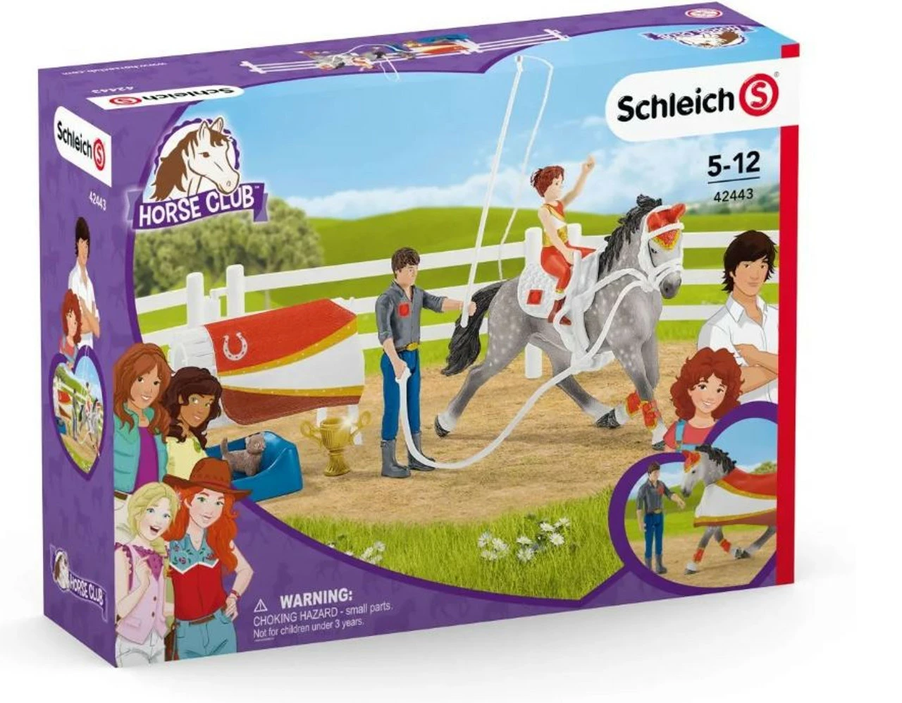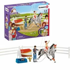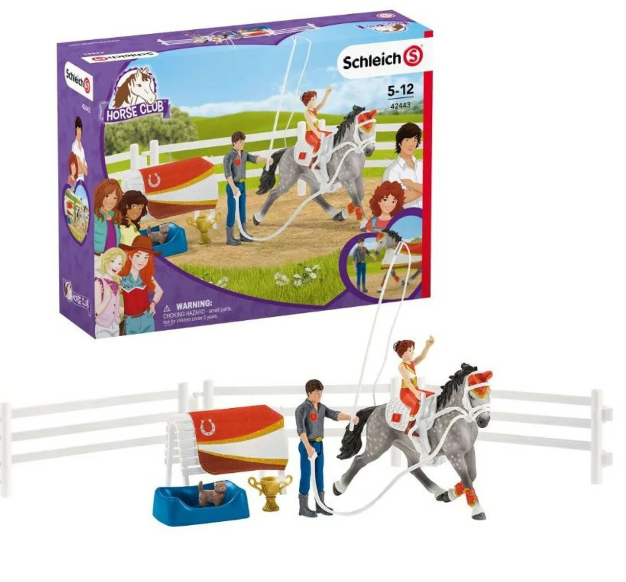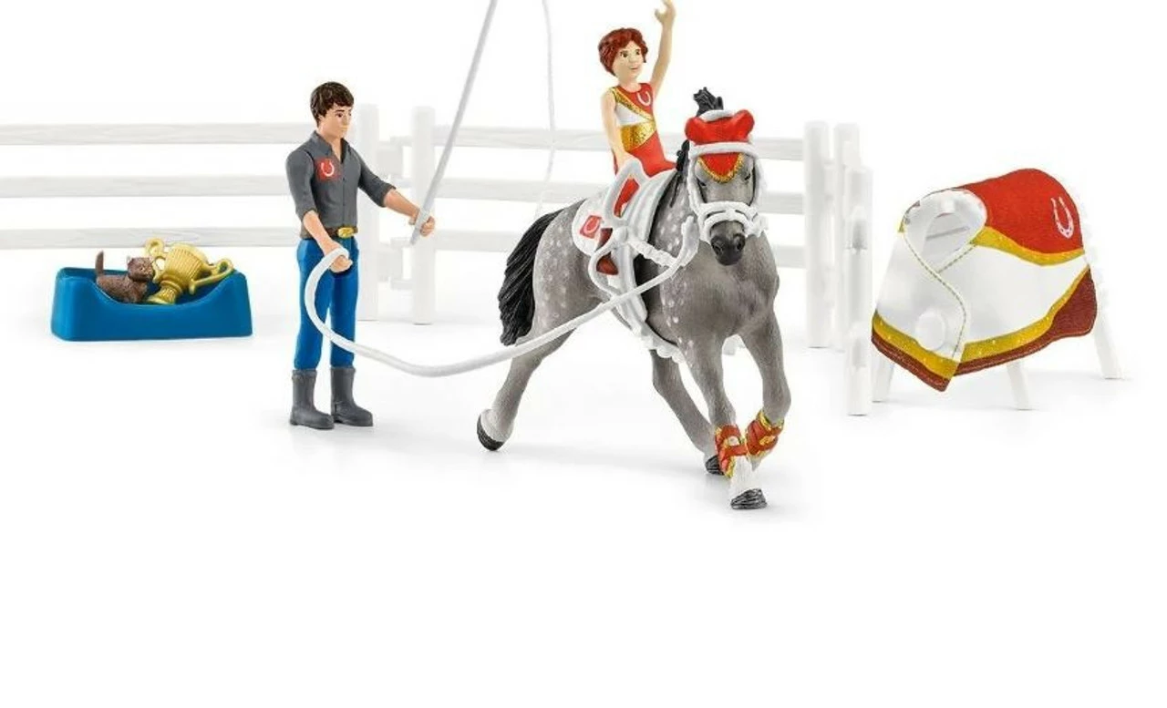The little girl, Mia, can perfectly prepare for her first competition with the help of the vaulting set by Schleich® Horse Club. The male riding instructor, Tom, steadies the show horse using the vaulting harness and gently flicks the whip in his gripping hand so that the horse runs evenly in a circle within the fence parts, which can be plugged in as desired. Hannah’s sister, Mia, has moving arms to hold on to and accept the big golden trophy. Saddle, bridle and blanket are removable and stored on the overhead storage shelf after training. The brown kitten watches the events with interest, as she snuggles into her cosy little basket. Schleich® figurines are modelled in the finest detail to help children learn while they play. Girl with movable arm! Tom can sit, stand and grip! Figurine, saddle, bridle and blanket can be removed! Fence parts can be connected in any way!