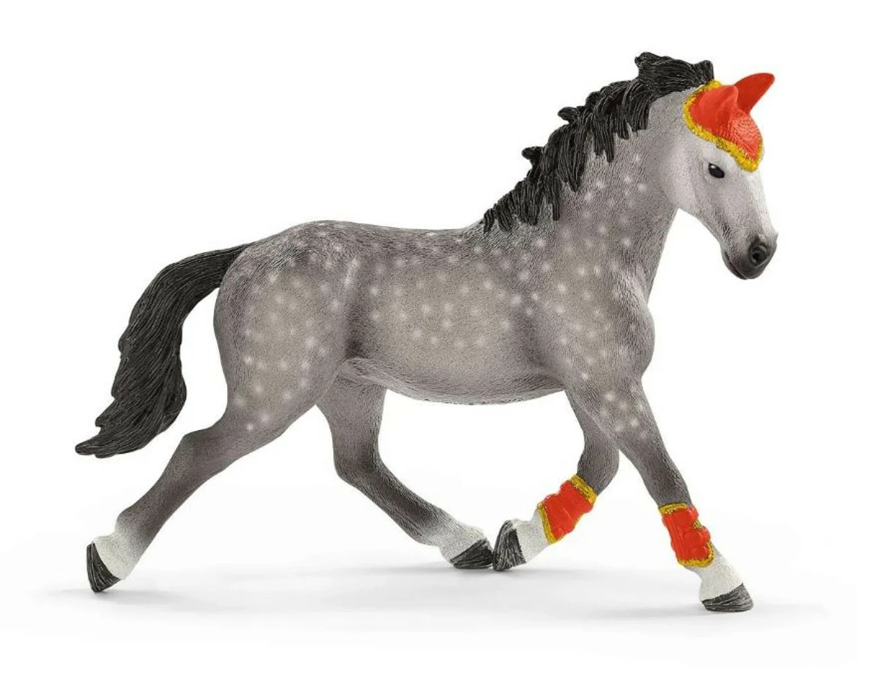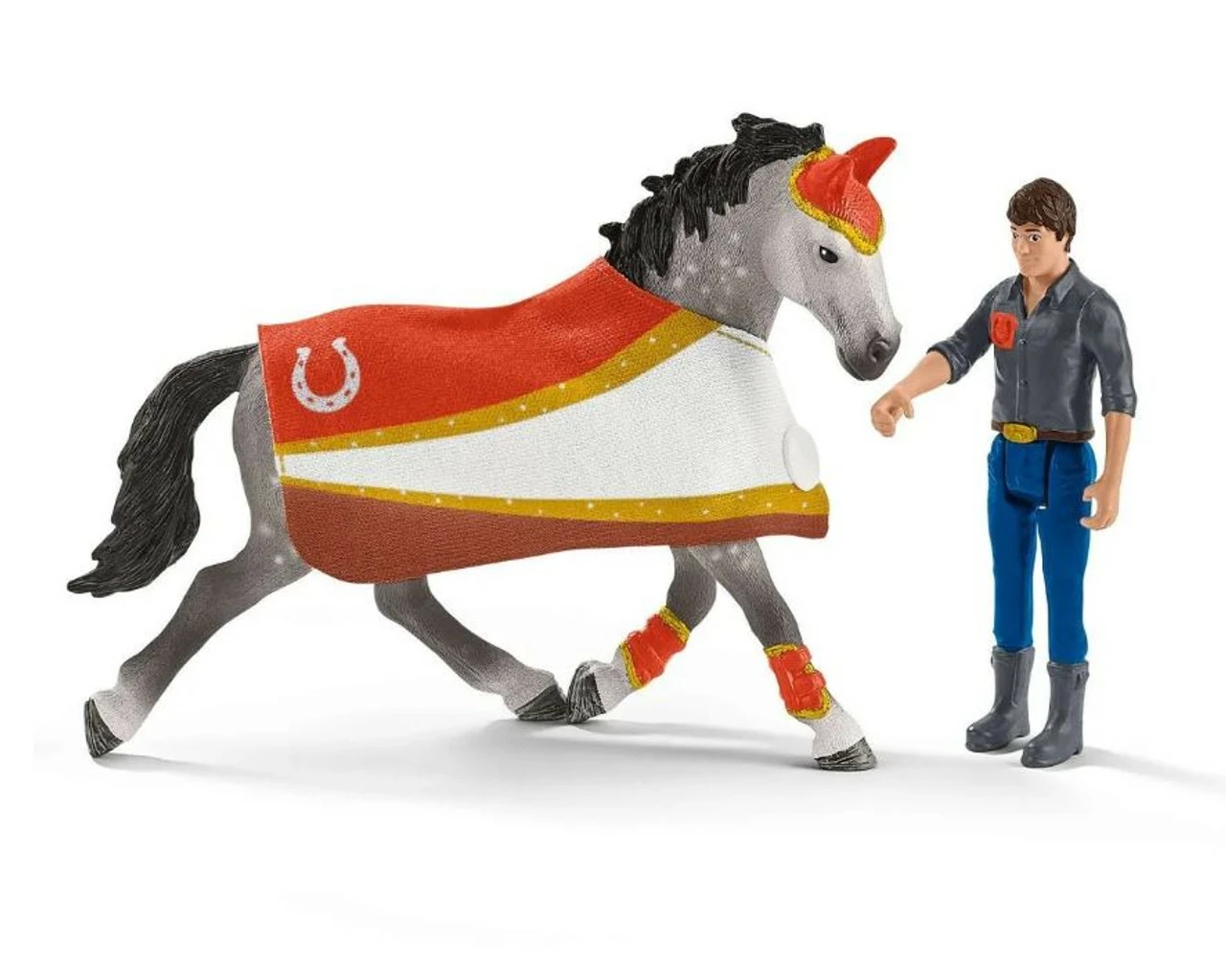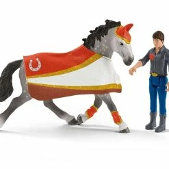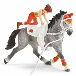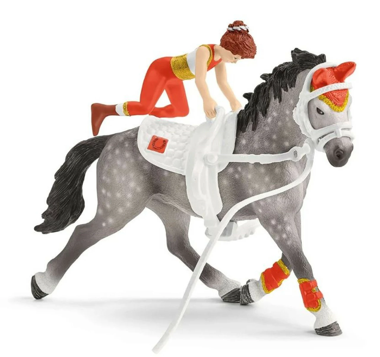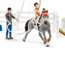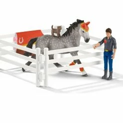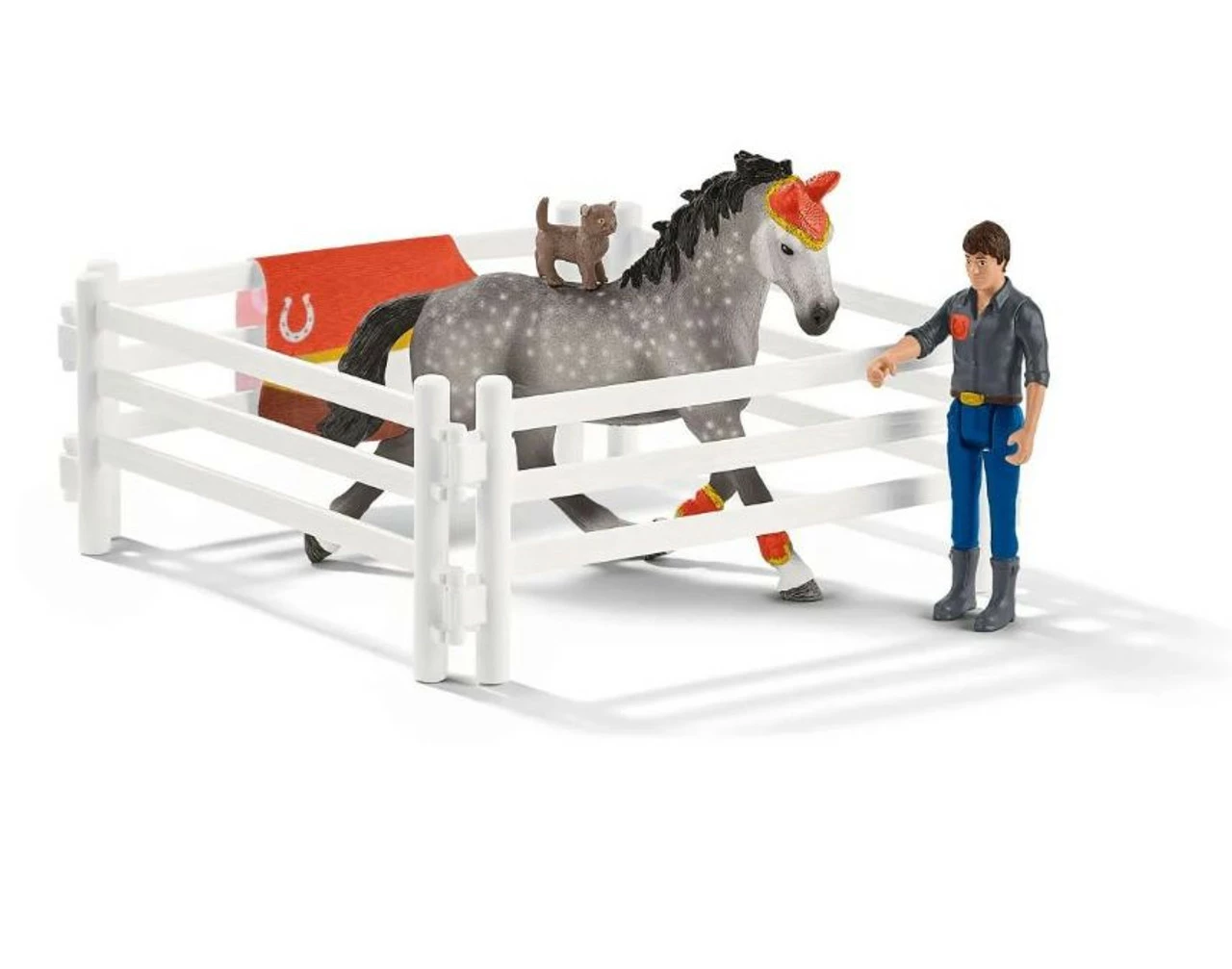 The little girl, Mia, can perfectly prepare for her first competition with the help of the vaulting set by Schleich® Horse Club. The male riding instructor, Tom, steadies the show horse using the vaulting harness and gently flicks the whip in his gripping hand so that the horse runs evenly in a circle within the fence parts, which can be plugged in as desired. Hannah’s sister, Mia, has moving arms to hold on to and accept the big golden trophy. Saddle, bridle and blanket are removable and stored on the overhead storage shelf after training. The brown kitten watches the events with interest, as she snuggles into her cosy little basket. Schleich® figurines are modelled in the finest detail to help children learn while they play. Girl with movable arm! Tom can sit, stand and grip! Figurine, saddle, bridle and blanket can be removed! Fence parts can be connected in any way!