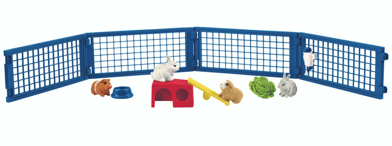 There’s plenty to discover in the rabbit and guinea pig hutch from the Schleich® Farm World. The animals hide in their hutch, suck at their drink bottle, nibble the lettuce or walk over the rocking toy. This also serves as a practical ramp that they can use to climb or hop onto the roof of their hutch. The fence sections can be connected in any way or combined with other Schleich® fences. Scratching post for playing around! Seesaw can also be used as a ramp! Fence parts can be connected in any way! Can be combined with other fences!