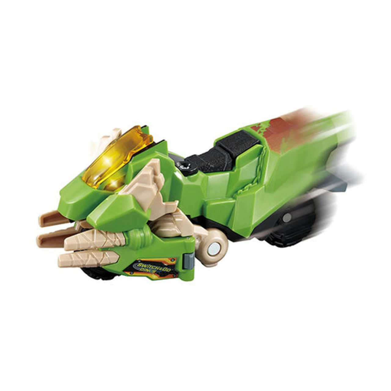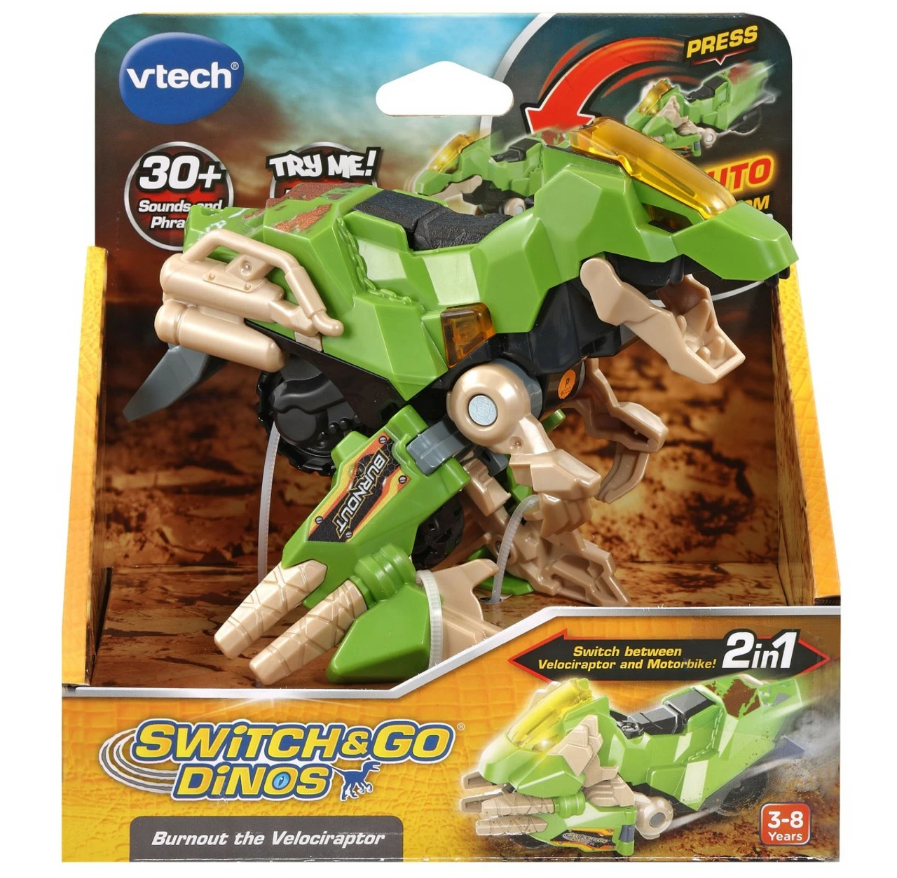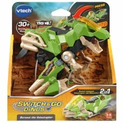 Introducing Burnout the Velociraptor Switch & Go Dino by VTech! This wild Switch & Go Dino is an exciting 2-in-1 toy which switches between a fierce Velociraptor and a tough motorcycle. Instantly switch from a motorcycle to a Velociraptor at the push of a button, and trigger exciting sound effects.