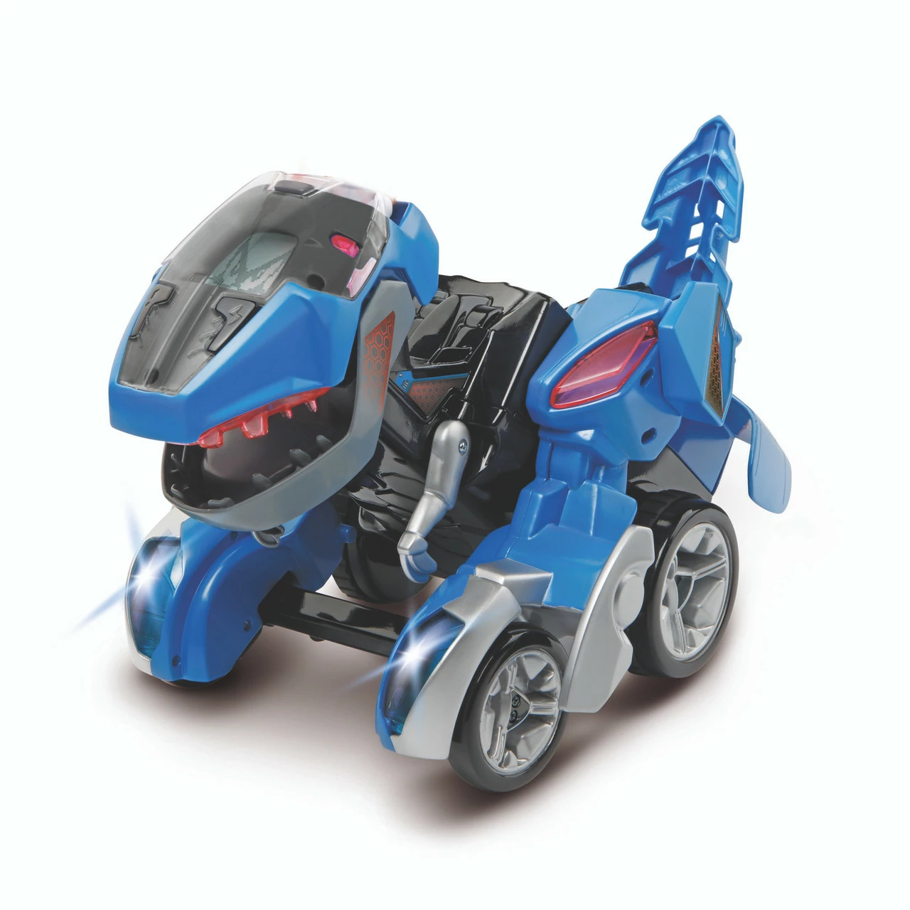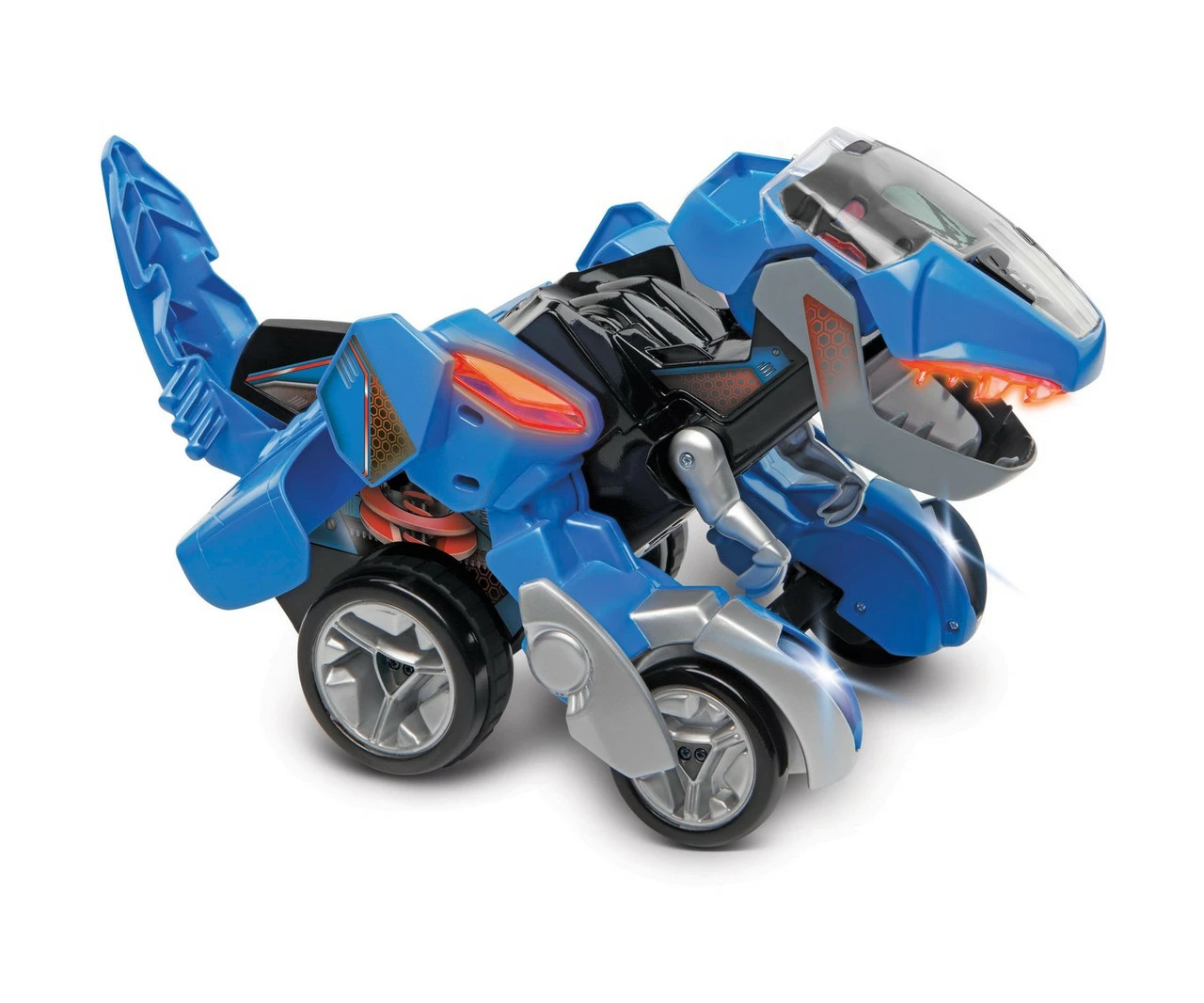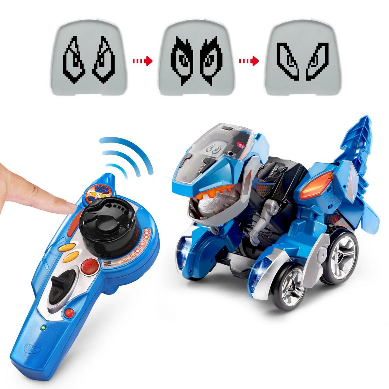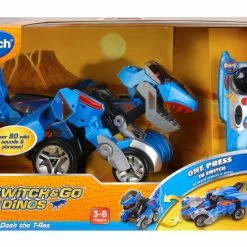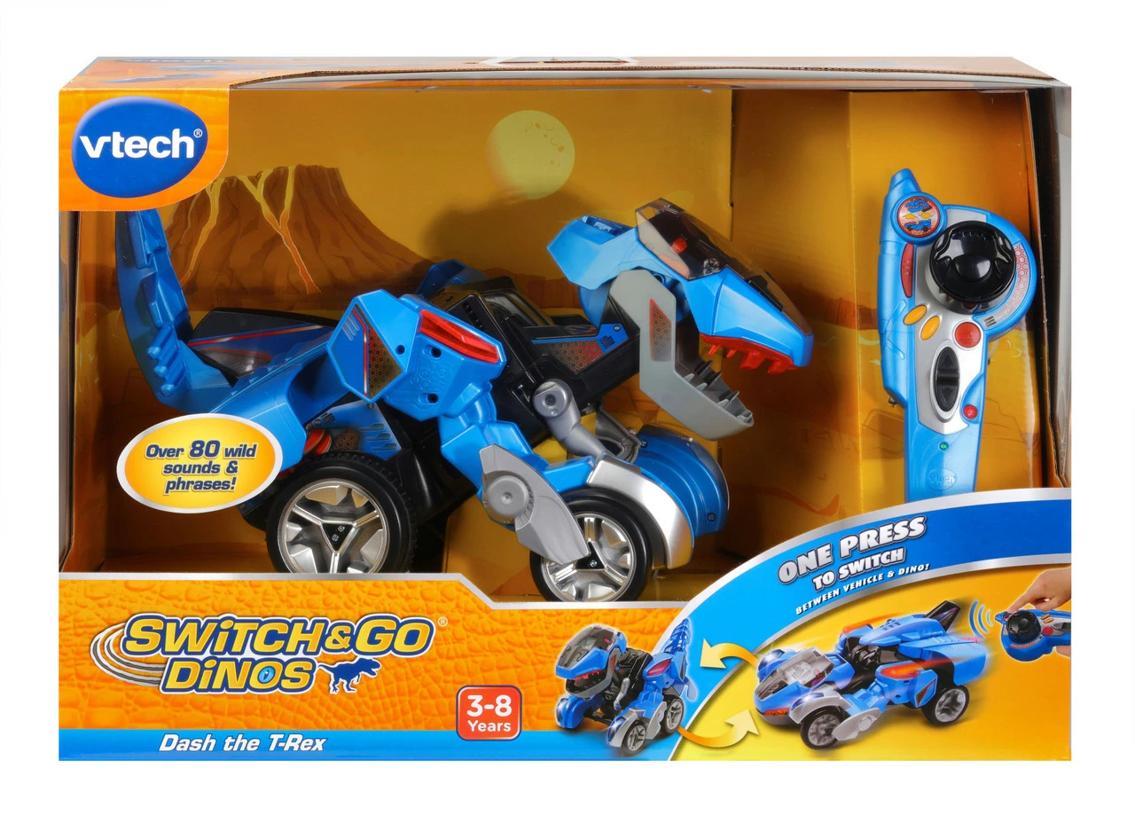 Dash the T-Rex is a fierce remote controlled dinosaur that automatically switches from a strong Tyrannosaurus Rex to a racer! Customise Dash by choosing from a selection of dinosaur eyes and drivers displayed on the LCD screen. Press the buttons on Dash and on the remote control to hear fun phrases, dinosaur facts and great sound effects. You can adjust the volume on the remote control for quieter play. Push the switch button on the remote control to watch Dash automatically switch between a Tyrannosaurus Rex and racer! This 2-in-1 toy is hard to put down! Just Switch & Go!