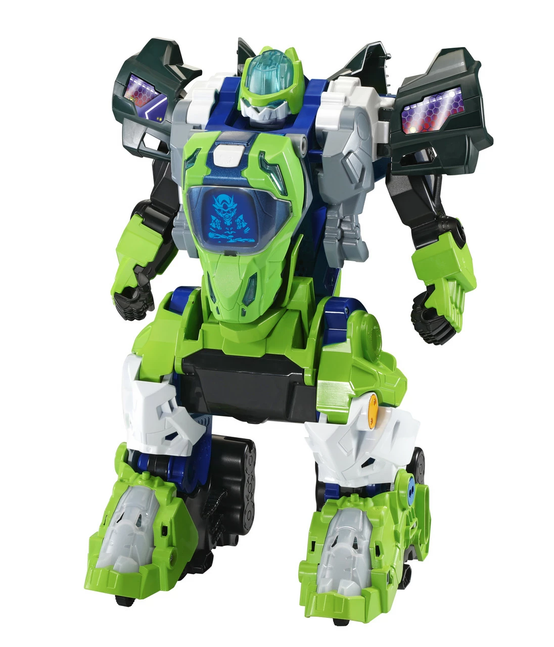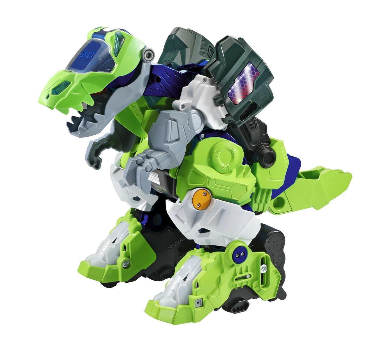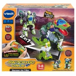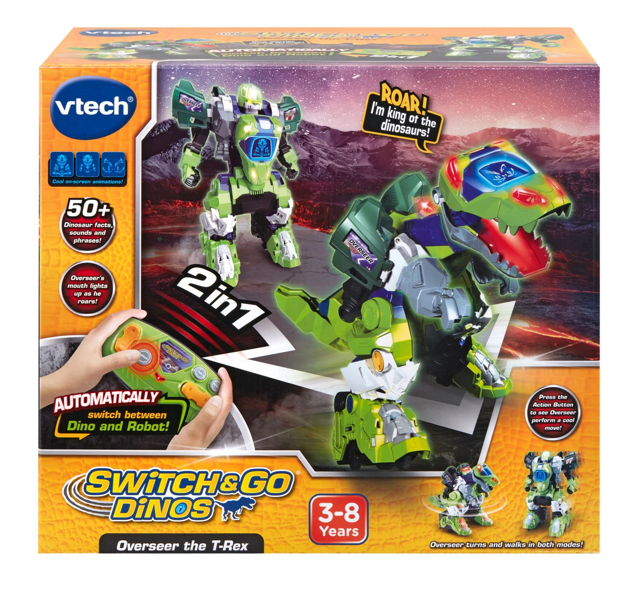 Introducing Overseer the T-Rex by VTech! This wild Switch & Go Dino is an exciting 2-in-1 toy which automatically switches between a fierce T-Rex and a mighty Robot! The backlit screen on Overseer displays animated dino eyes and robot controllers! Use the remote control to move Overseer and see them stomp their legs! Pressing the Talk Button triggers fun phrases and cool dinosaur facts! Overseer also responds with lively dinosaur and robot sounds! They even light up with the responses! The Stunt Button makes Overseer perform cool actions! Hear even more great sounds when Overseer moves and switches between dinosaur and robot!