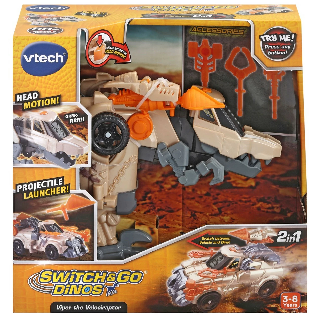 Introducing Viper the Velociraptor by VTech! This wild Switch & Go is an exciting 2-in-1 toy which switches between a fierce Velociraptor and a tough car! Easily switch between dino and vehicle modes in just a few simple steps! See cool dino eye and driver animations on the LCD screen!