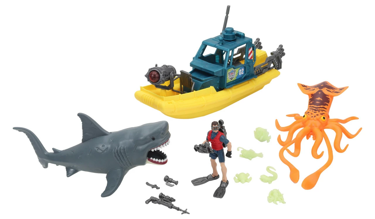 20 cm Anglerfish with mechanical jaw action 33 cm Speed boat with light and sound 2 x AG 13 Batteries included 10 CM height Articulated action figure
