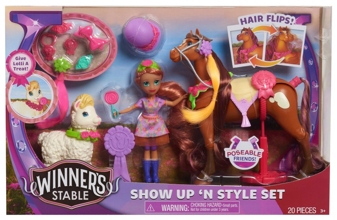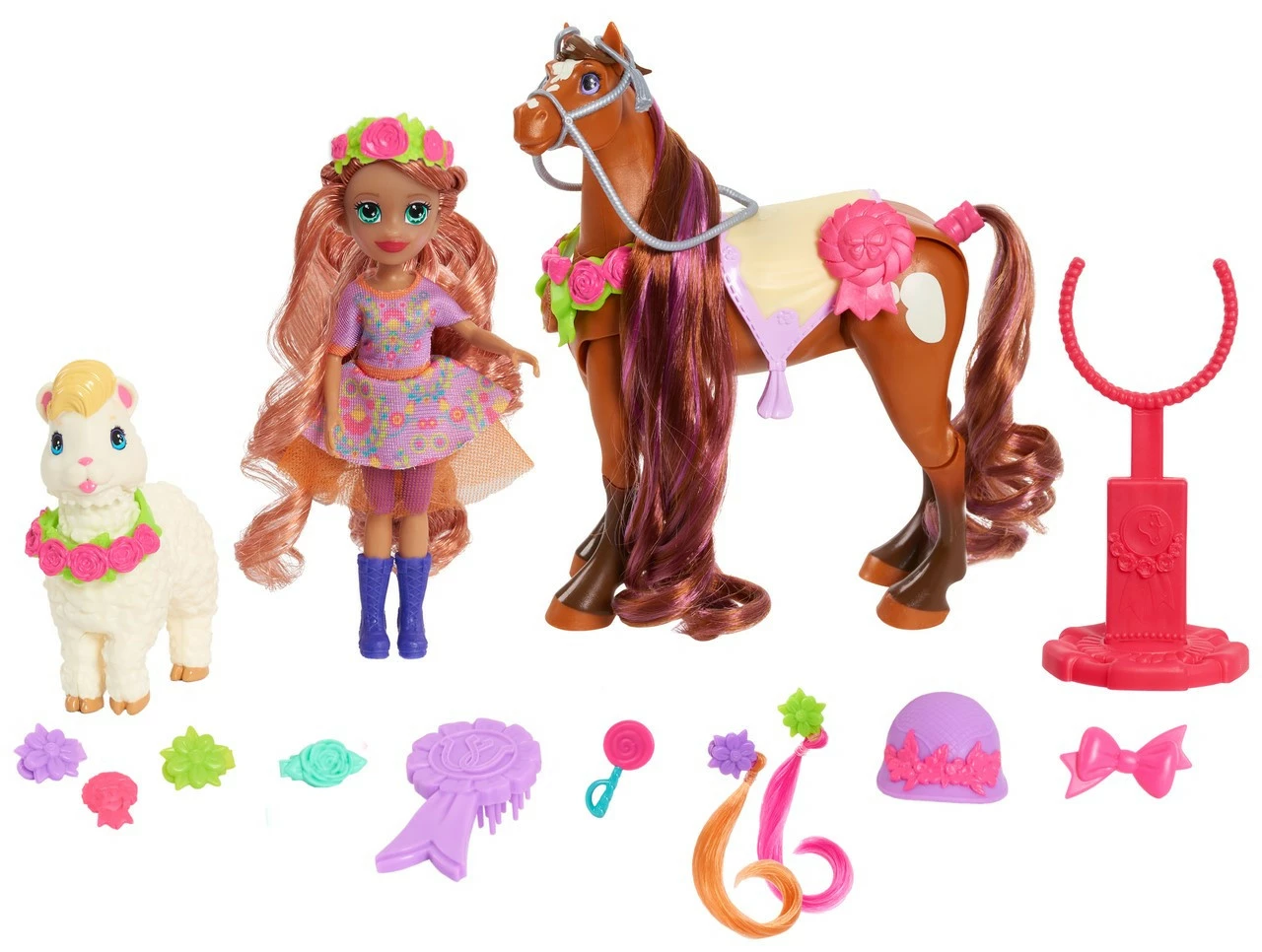 his 20-piece set includes: one 12cm Valentina Doll, one 17cm Charra Feature Horse, one 11cm Loli llama figure, one riding helmet, one necklace, one flower crown, two barrettes, two hair extensions, one brush, one saddle, one bridle with rein, one flower wreath, one horse ribbon, one flower necklace, one llama ribbon, one lollipop candy, and one horse stand.